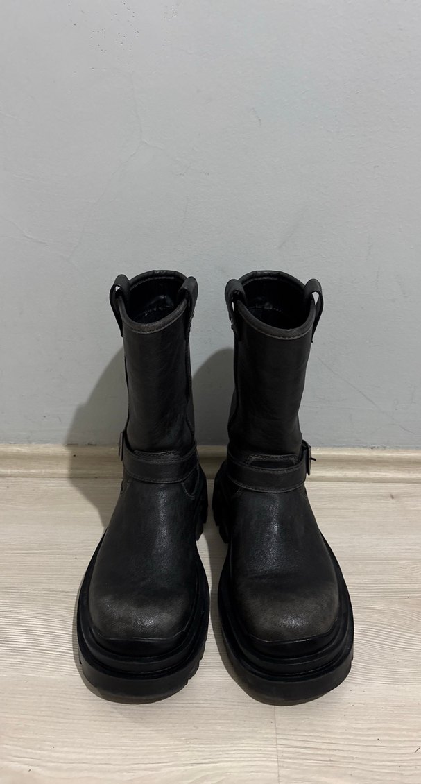 Siyah deri, tokalı biker botlar, blok topuklu, gotik rock punk tarzı günlük kullanım için uygundur.