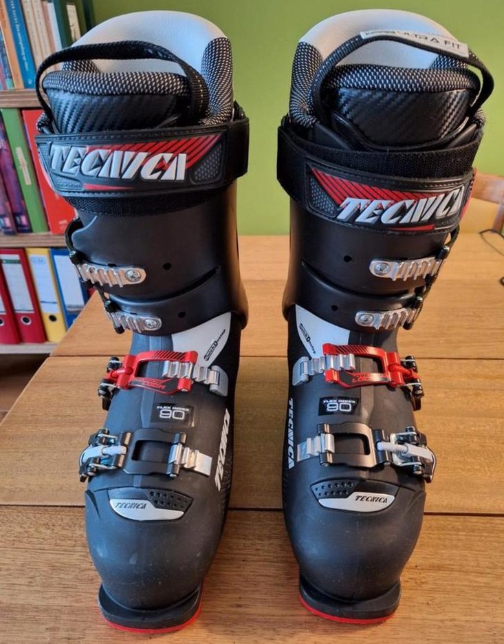Erkek siyah desenli kayak botları, Velcro bantlı, kauçuk malzemeden, sportif biker tarzında. 'TECNICA' markası bulunur.