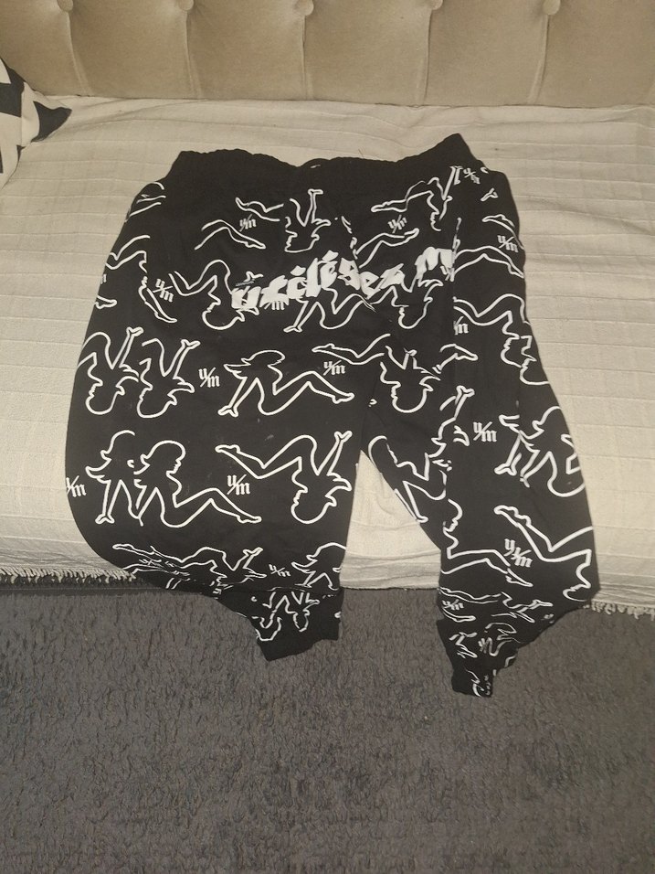 erkek için siyah renkli, beyaz soyut desenlere sahip, yumuşak kumaştan rahat kesim midi boy eşofman. Sokak stili ve günlük konforu bir arada sunar.