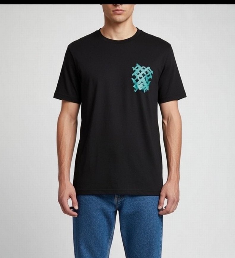 Erkekler için kısa kollu, yuvarlak yakalı, göğüste mavi batik detaylı siyah bol kesim tişört. Günlük kullanım için yumuşak sentetik kumaştan yapılmıştır.