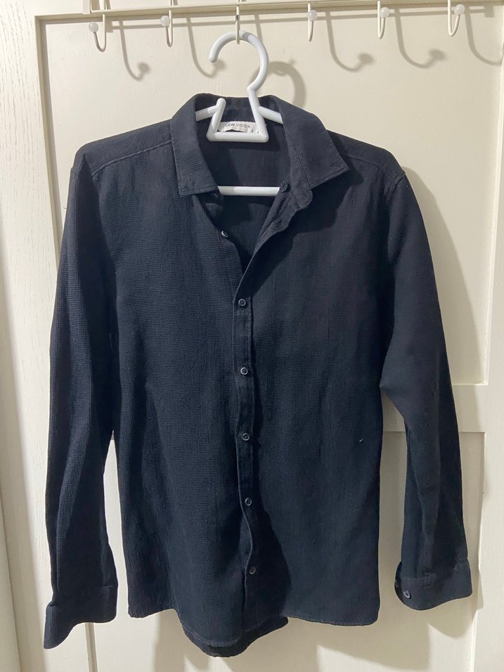 Siyah dokuma, uzun kollu erkek gömleği. Normal kesim, sade ve desensiz, ofis ve günlük kullanım için uygun.