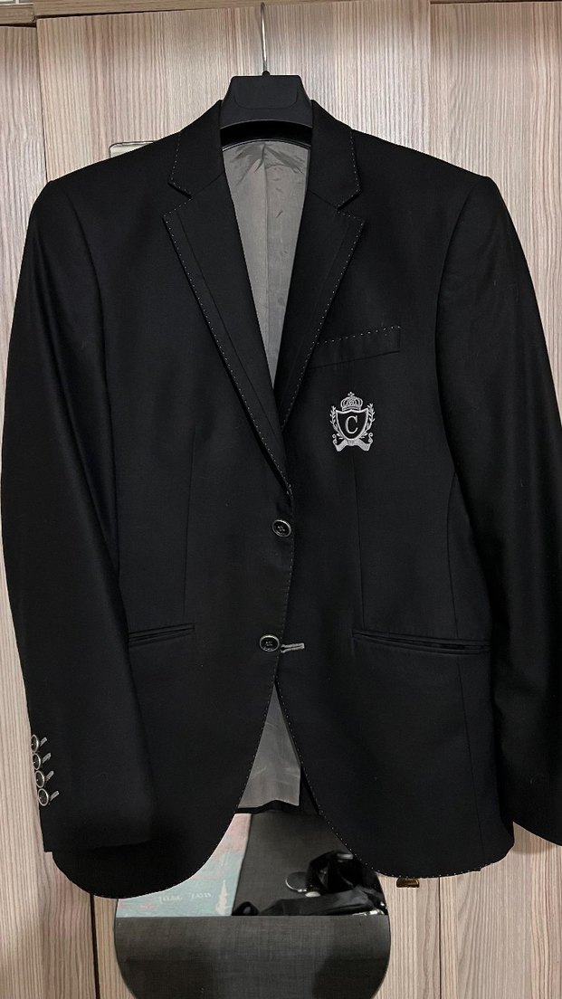 Siyah renkli, düğmeli erkek ceket, normal kesim ve uzun kolludur. Notch yaka ve klasik şıklık sunar, iş ve sokak stili için uygundur.