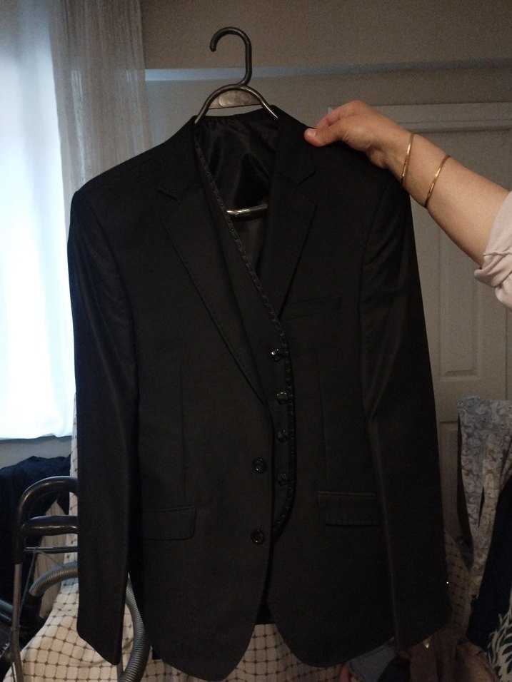 Damatlık,bir kez kullanıldı ve dolapta bekliyor..Siyah erkek ceket, notch yakalı ve uzun kollu, düğmeli ön kısmı ve regular fit kesimiyle. Ofis için klasik ve şık tarzda uygundur.