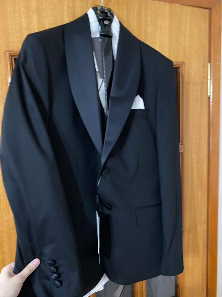 Düğmeli ön kısmı ve kesik yaka detayıyla siyah erkek ceket. Normal boy ve klasik ofis görünümü için uygun. Askılı kollu ve desensiz, modern şıklık sunar. ️Damatlık sıfır etiketli altın yıldız ceket gömlek kemer kuşak papyon kol düğmesi süeteri mevcuttur.