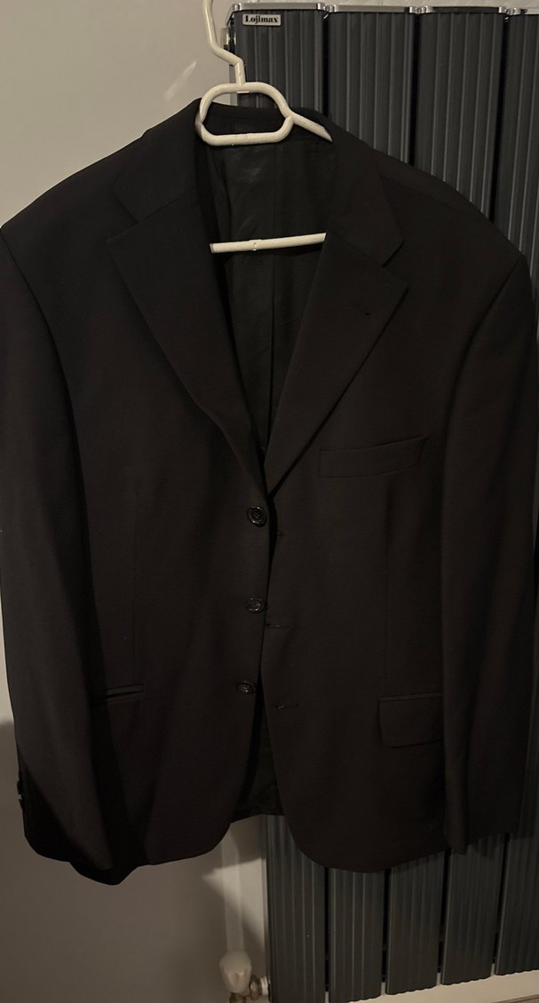Erkek siyah takım elbise, klasik kesim, tek düğmeli ve uzun kolludur. Ofis için uygun, sade ve şık bir görünüme sahiptir. ️