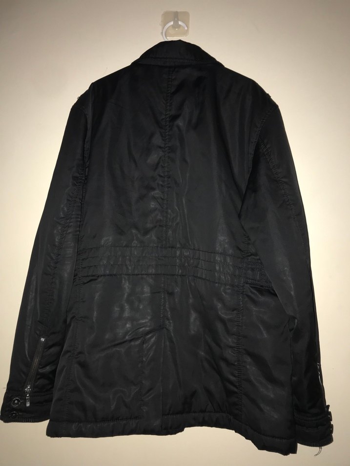 Erkek siyah ceket, düğmeli ve kesik yaka detayına sahiptir. Sentetik kumaştan yapılmış, normal kalıp ve uzun kolludur. Sokak stili için uygundur.