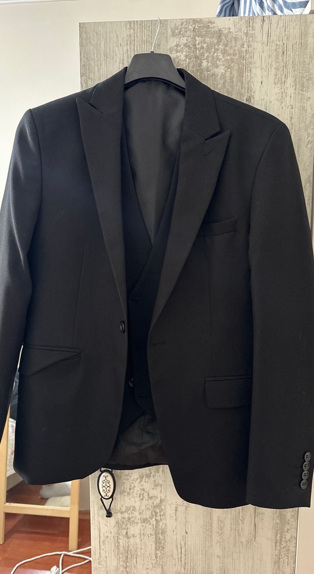 Siyah renkli, düğmeli ve kesik yakalı erkek takım elbise. Normal kesim, uzun kollu, ofis kullanımı için uygun.