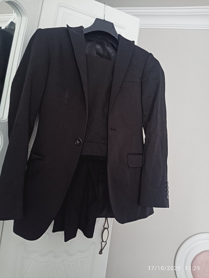 Erkek siyah takım elbise, kesik yakalı ve regular fit. Düğmeli, askılı kollu, iş ve ofis için uygun goth tarzında.