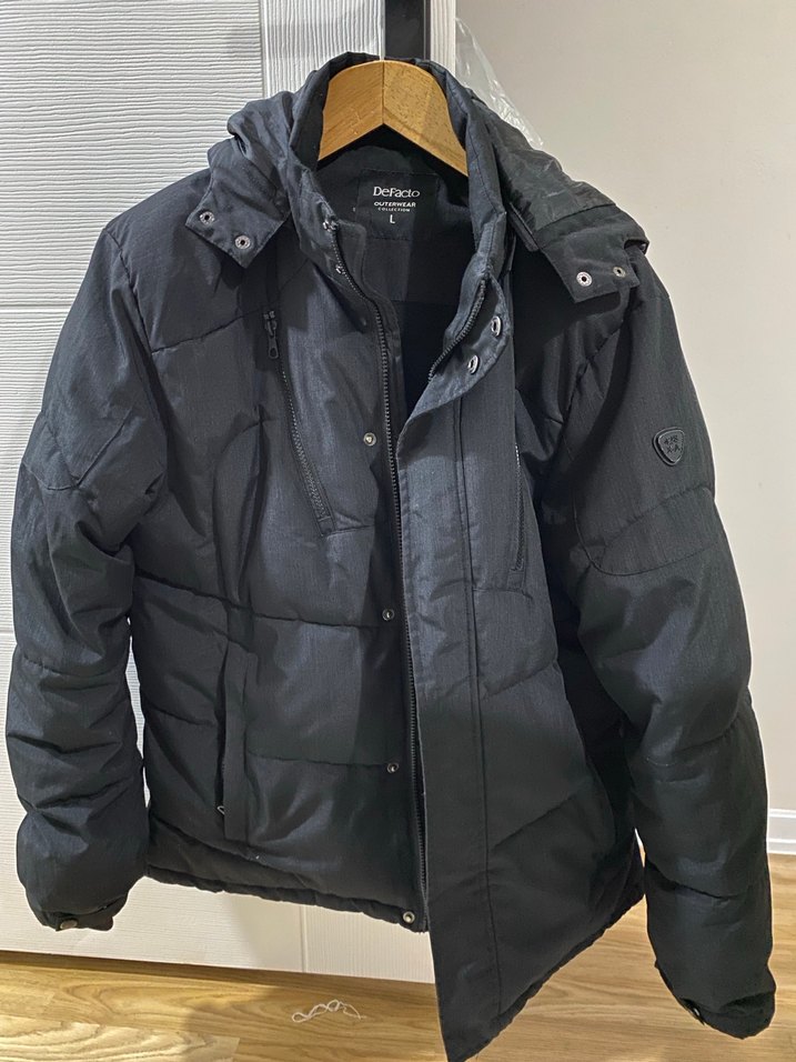 Erkek siyah düğmeli street style mont, notched lapel yaka ve midi boyda. Uzun kollu, sentetik kumaştan, günlük rahat kullanım için uygundur.