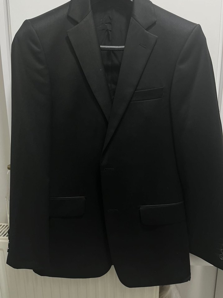 Erkek siyah takım elbise, klasik kesim, uzun kollu ve düğmeli ön kısmıyla ofis kullanımına uygundur. Desensiz ve normal boydadır burda şeçenek yoktu 44 6 drop hatemoğlundan alındı