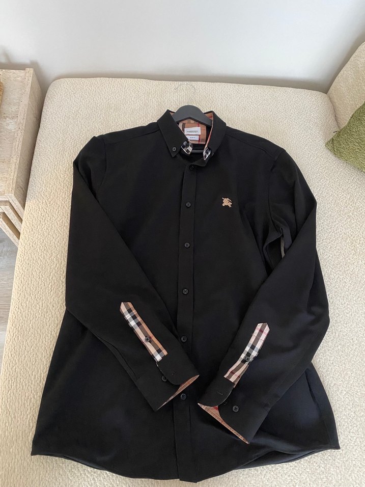Erkek siyah uzun kollu gömlek, düğmeli ve ekose detaylı manşetlere sahiptir. Normal kesim