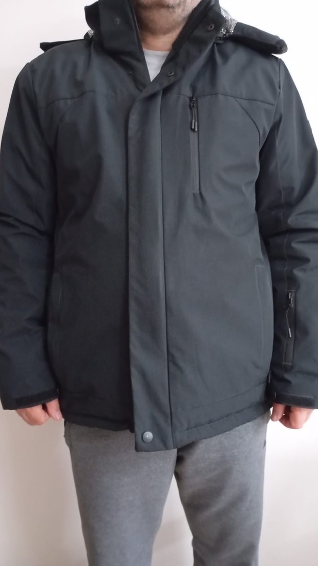 Erkekler için siyah midi mont çentikli yaka ve fermuarlı ceplerle. Normal kesim, uzun kollu, sentetik kumaştan, dış mekan kullanımı için uygun. 2-3 kere kullanıldı.