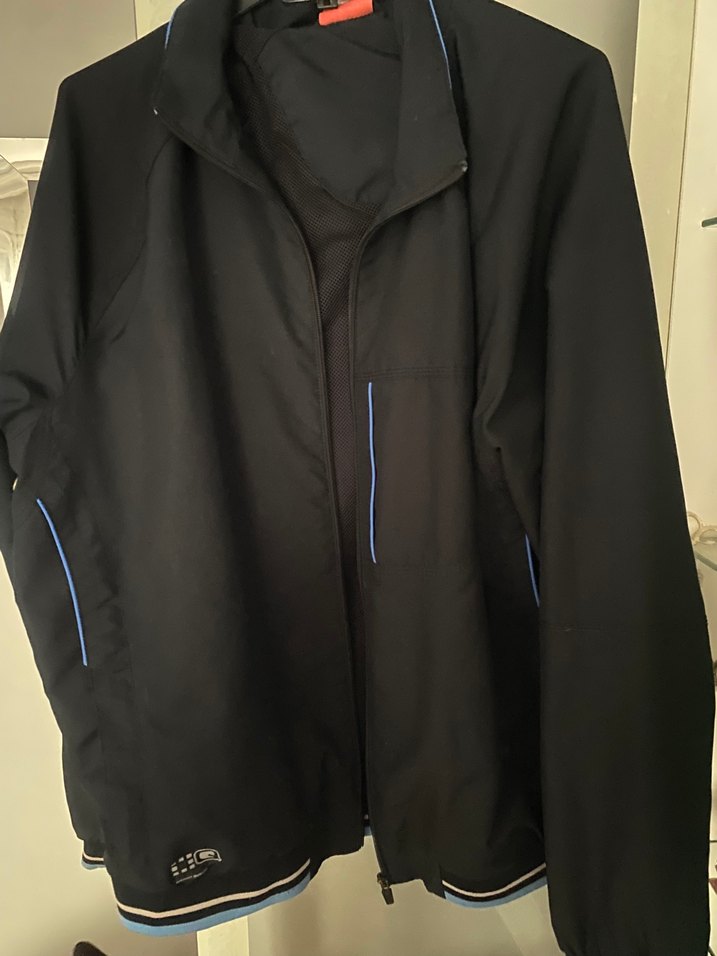 Erkek siyah ceket fermuarlı, yakalı ve uzun kolludur. Sentetik kumaş ile günlük kullanıma uygundur, cep ve etek kısmında mavi detaylar bulunur. ️