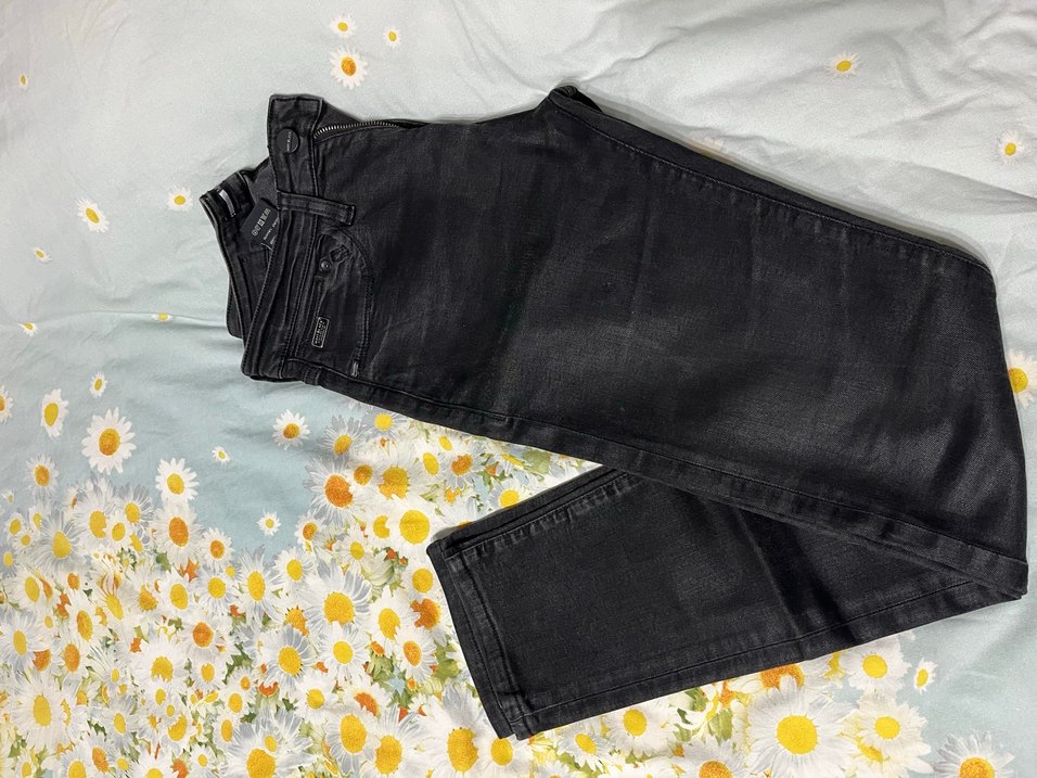 Siyah fermuarlı, dar kesim denim pantolon. Normal boyda ve günlük sokak stili için uygun. 27/32 beden