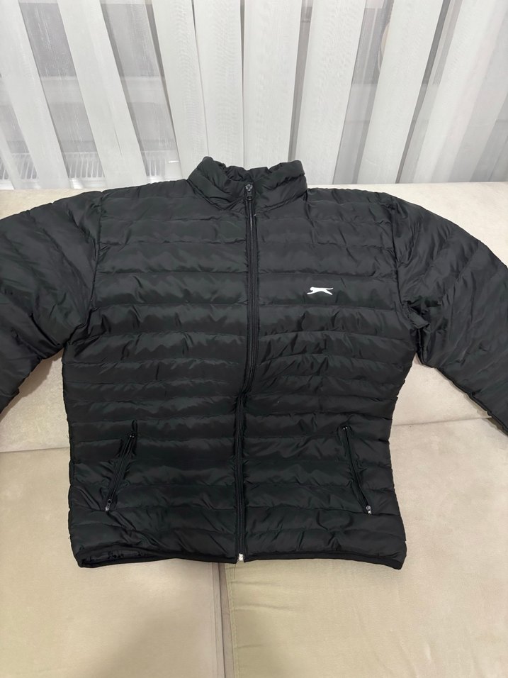 Siyah, fermuarlı cepli, dik yakalı ve uzun kollu erkek mont. Yumuşak, sıcak kumaştan, sokak ve athleisure tarzına uygun.