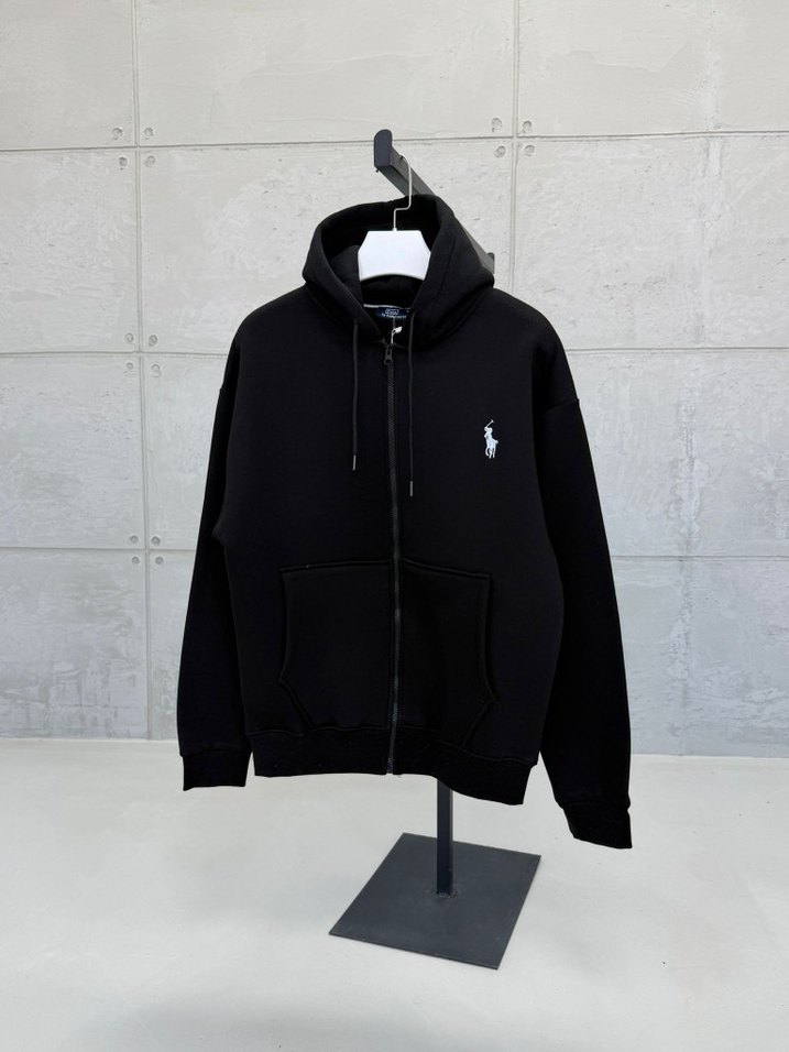 Siyah, fermuarlı ve kapüşonlu, yumuşak ve sıcak kumaştan erkek sweatshirt. Uzun kollu ve minimal logo detaylı, günlük kullanım için uygun.