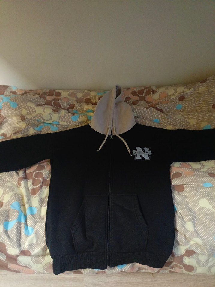 Fermuarlı önü ve uzun kollu, siyah renkli erkek kapüşonlu sweatshirt. Yumuşak polar kumaştan, normal boyda ve günlük kullanım için uygun.
