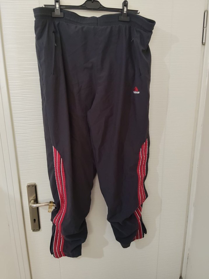 Siyah, fermuarlı cepleri ve kırmızı yan şeritleri olan, sentetik kumaştan erkek rahat kesim eşofman altı.