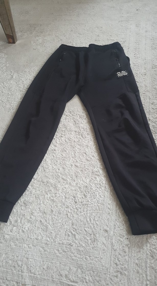 Erkekler için siyah, rahat kesim eşofman altı. Fermuarlı cepler ve yumuşak, sıcak kumaş kullanılmış. Sokak tarzı için uygun. Crew yaka detaylı. iyi durumda hafif cep tarafında tüylerden olabilir