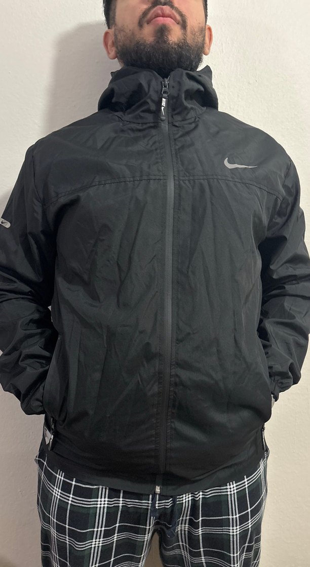Erkek siyah rüzgarlık, yüksek yakalı ve fermuarlı. Sentetik kumaştan, uzun kollu ve bol kesimdir, günlük kullanıma uygundur. ️