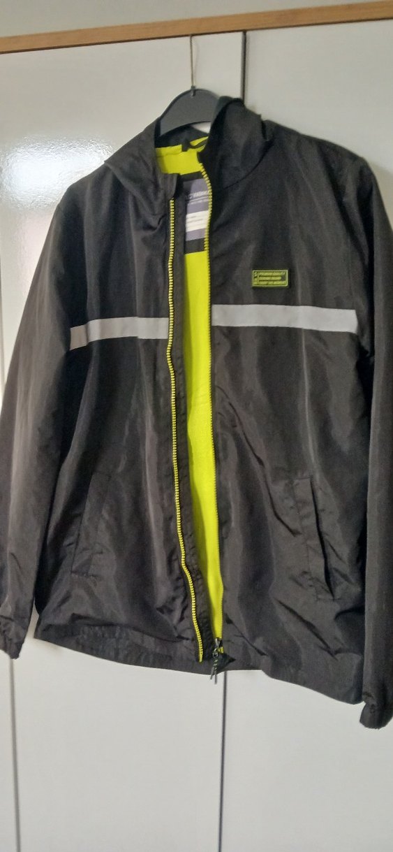 Erkekler için fermuarlı, yüksek yakalı, siyah renkli, yansıtıcı şeritli sokak stili yağmurluk. İç kısmı yumuşak ve rahat dokulu. ☔