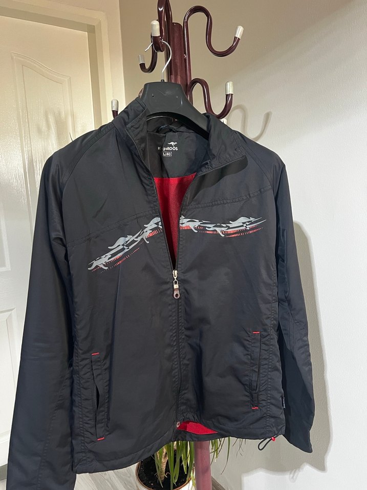 Yüksek yakalı, uzun kollu ve dar kesimli siyah erkek eşofman üstü. Sentetik kumaştan, fermuarlı ve baskılı desene sahip, spor tarz için uygun.