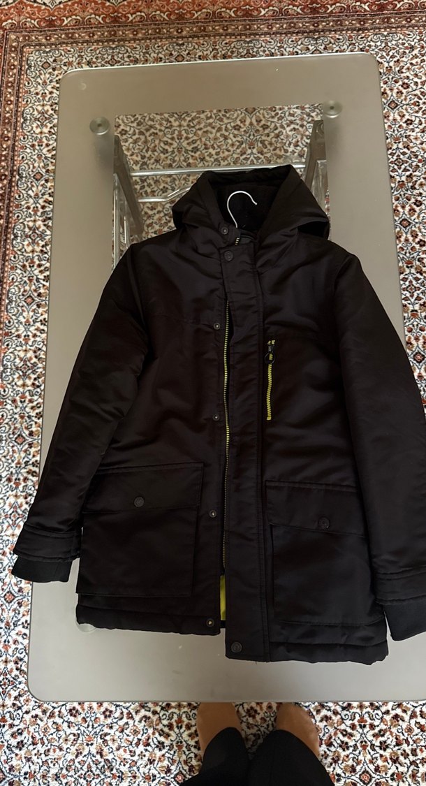 Fermuarlı, düz siyah erkek kaban, notched lapel yaka ve dar kesim ile dikkat çeker. Yumuşak ve sıcak kumaştan üretilmiştir. Çok az kullanıldı yeni gibi