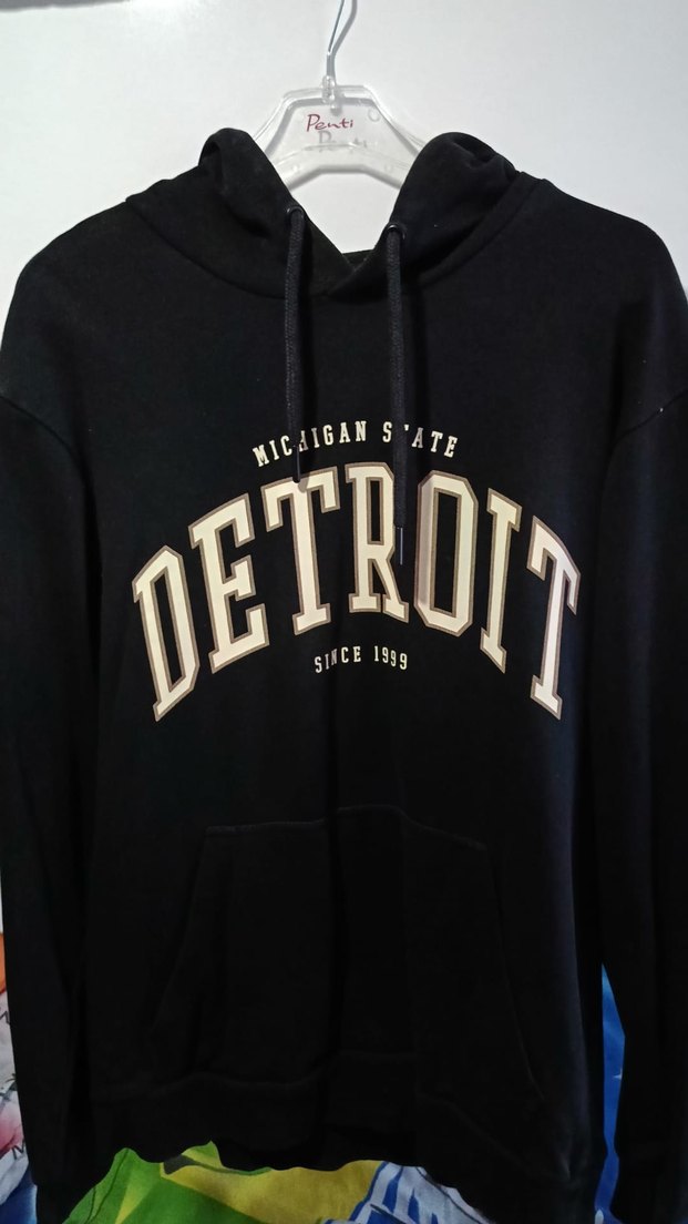 Siyah, fermuarlı, uzun kollu ve bisiklet yaka, baskılı 'DETROIT' yazılı, sentetik kumaştan, sportif kullanıma uygun dar kesim sweatshirt.