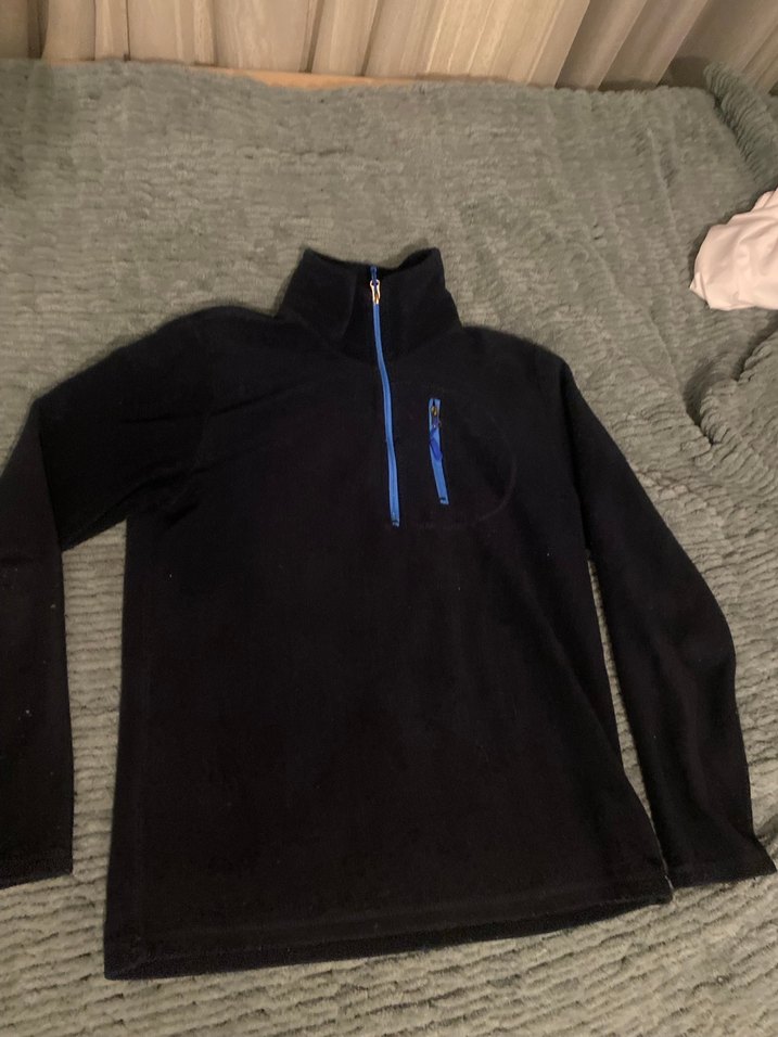 Erkek siyah polar, uzun kollu ve yarım balıkçı yaka. Fermuarlı göğüs cebine ve ön fermuara sahip, dış mekan için uygun rahat kesim.
