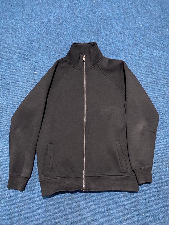 Erkek siyah sweatshirt, yüksek yakalı ve fermuarlı. Uzun kollu, vücuda oturan kesimde, 3 ipliktir.