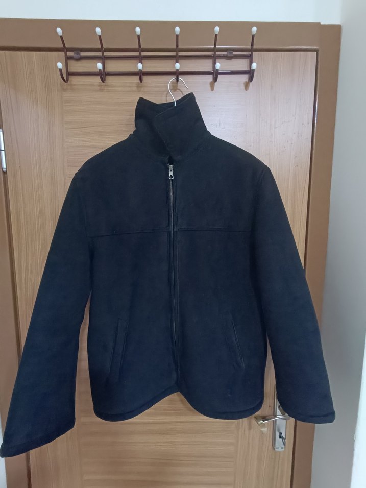 Erkek siyah mont , yüksek yakalı ve fermuarlı, normal kesim, yumuşak ve tüylü kürk gibi kumaştan, günlük kullanıma uygun. temiz düzgün bir problemi yoktur. 2 no bedeni
