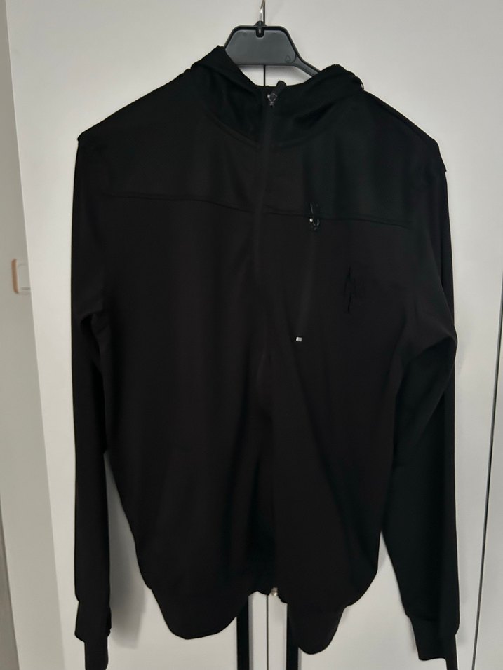 Erkek siyah sweatshirt, fermuarlı yüksek yakaya ve uzun kollara sahiptir. Düz, ince kesim ve sentetik yumuşak kumaştan üretilmiştir. Dış mekan kullanımı için uygundur.