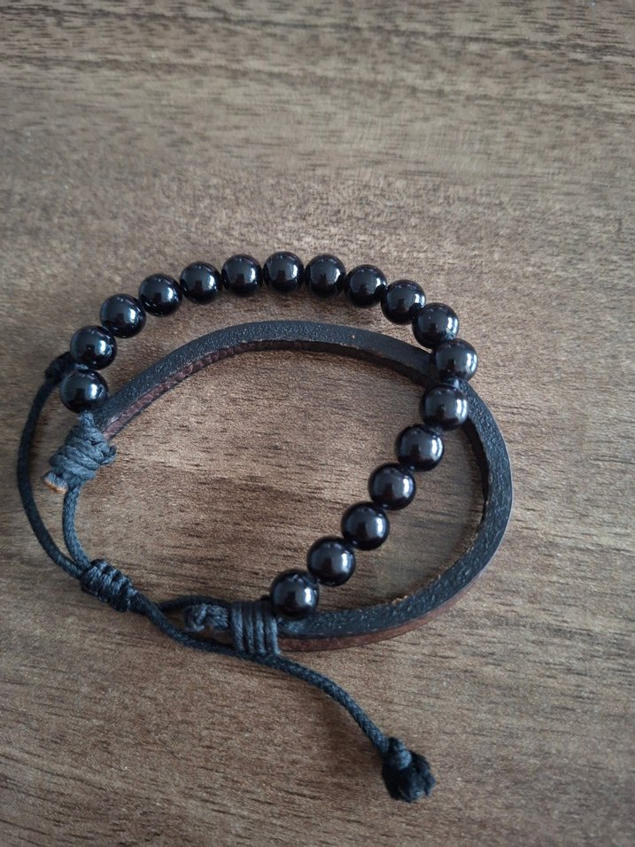 Siyah boncuklu ve koyu deri kayışlı, ayarlanabilir kapanışa sahip bileklik. Minimalist ve retro tarzlara uygundur.