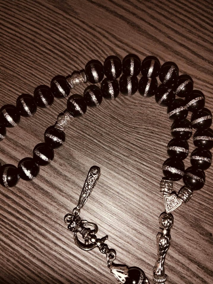Gotik tarzda detaylı gümüş aksanlı siyah tesbih. Yuvarlak boncuklar ve karmaşık metal parçalarla tamamlanmıştır. ✨