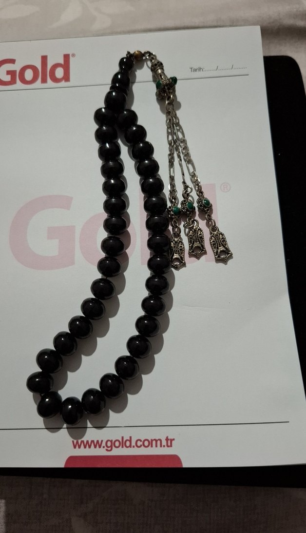 Koyu renkli siyah boncuklardan oluşan gotik tarzda erkek tespihi, detaylı metal püsküllerle tamamlanmıştır. Gold markalı.