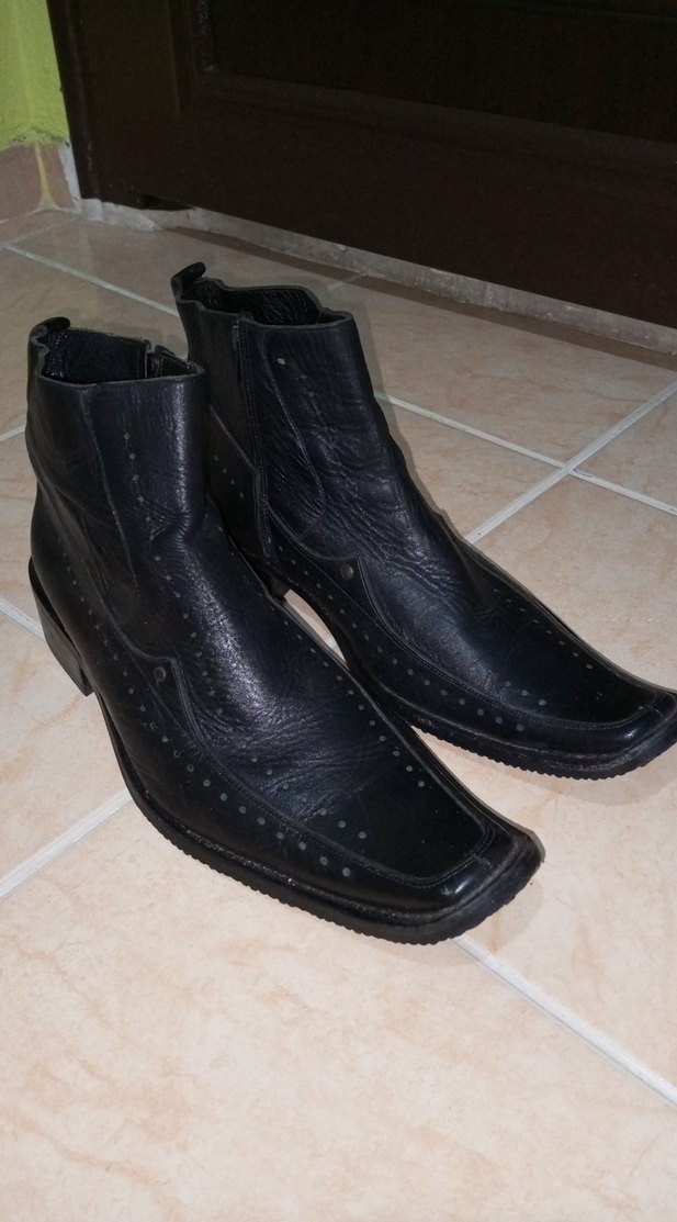 Tokalı, siyah erkek gotik botları. Düz ve koyu renkte, sivri burunlu ve pürüzsüz yüzeye sahip. Kalkık burun deri özel yapım ayakkabı