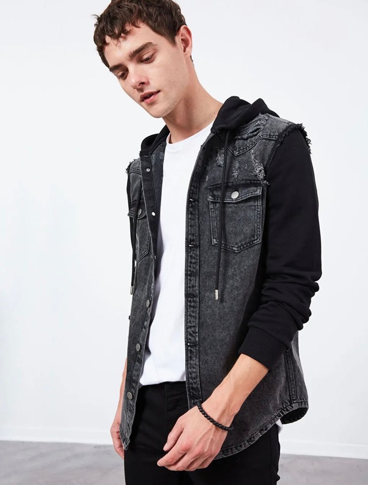 Erkek Siyah Gri Batik Desenli Denim Yelek