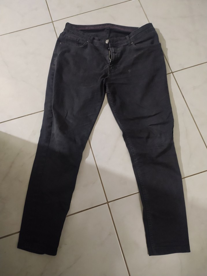 Siyah gri renkte, regular fit ve normal boyda erkek denim pantolon. Günlük kullanım için rahat ve şık sokak tarzı. lekesi var çıkar arka cep sökük yaptırılir 32 33 beden