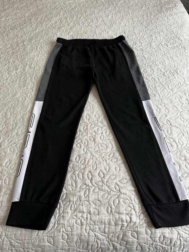 Erkekler için siyah, gri yan panelli ve beyaz şeritli, fermuarlı cepleri olan, yumuşak ve sıcak kumaştan eşofman altı.