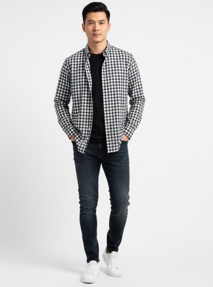 Erkekler için normal kesim, uzun kollu ve bisiklet yaka denim gömlek. Siyah ve gri kareli deseniyle günlük kullanımda zahmetsiz şıklık sunar.