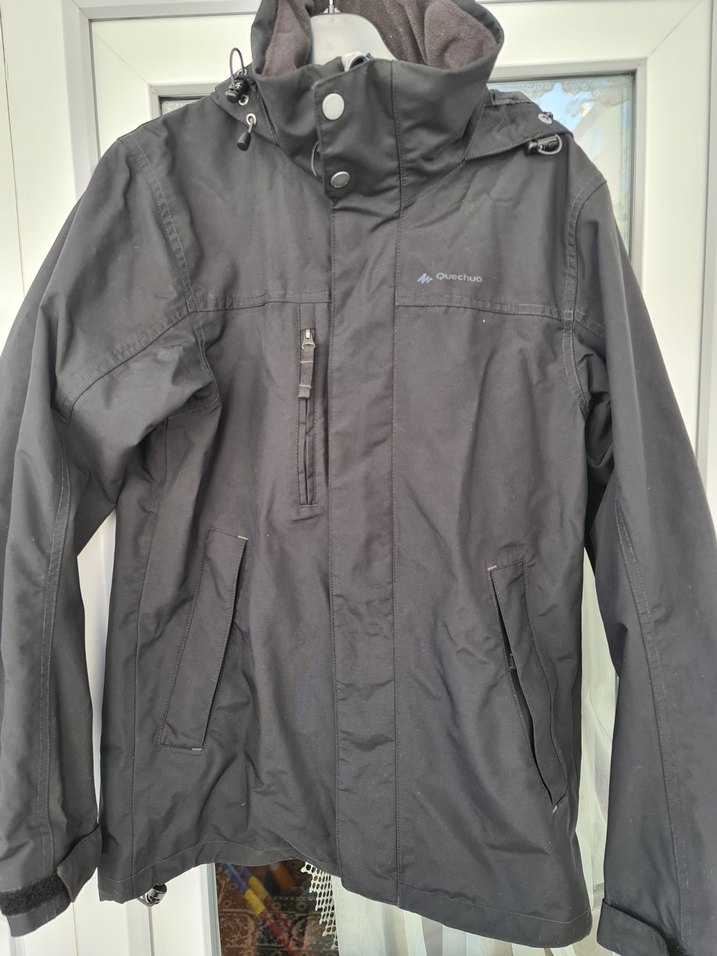 Erkek siyah rüzgarlık, yüksek yaka, fermuarlı cepler ve bol kesim ile sentetik kumaştan üretilmiştir, açık hava için uygundur. ️