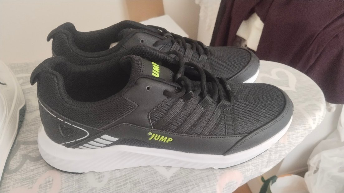 Siyah erkek koşu ve antrenman ayakkabısı, baskılı detaylar ve cırt cırtlı. Kauçuk tabanlı, JUMP logosu bulunur. ♂️