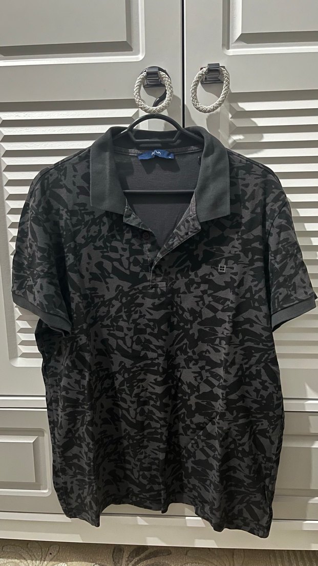 Erkekler için siyah kamuflaj desenli, düğmeli, kısa kollu, yakalı ve bol kesim polo tişört. Sentetik kumaştan üretilmiştir, günlük rahat kullanım için uygundur. Avva marka Xl bedendir