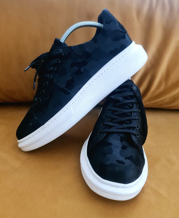 Erkekler için koyu siyah kamuflaj desenli, kalın beyaz kauçuk tabanlı spor ayakkabı. Sokak stili ve spor için şık ve rahat görünüme sahip.