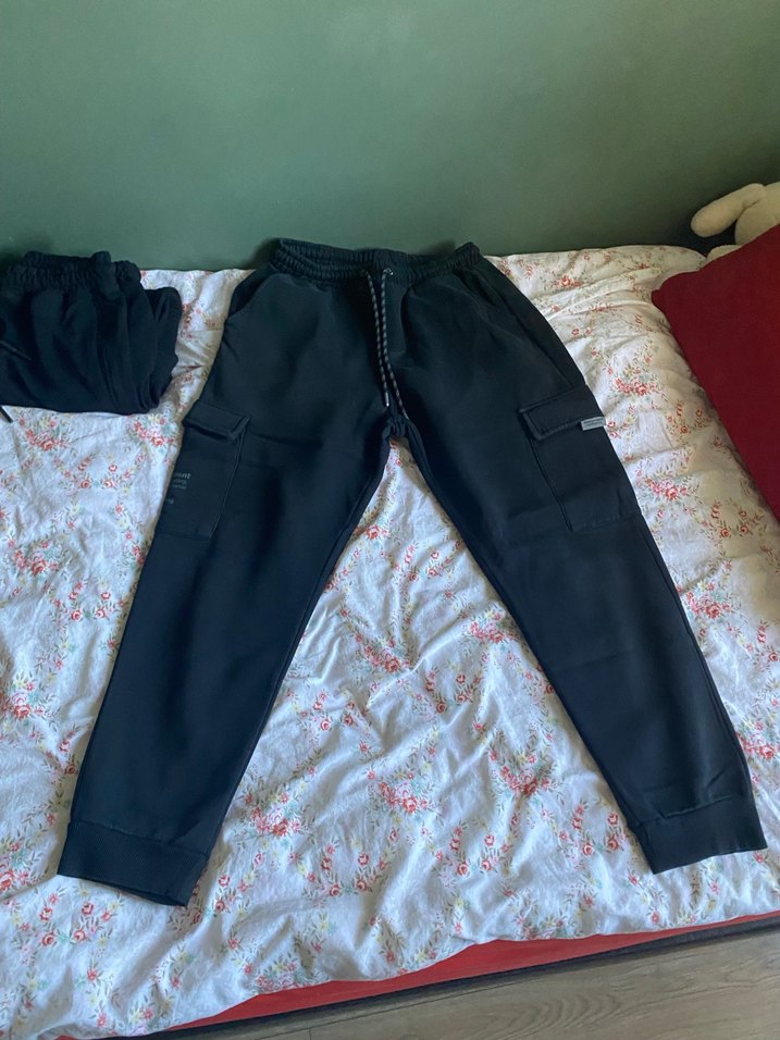 Erkekler için siyah, kapüşonlu, bol kesim ve kemerli eşofman altı. Yumuşak ve sıcak kumaştan, sokak stili için uygundur.