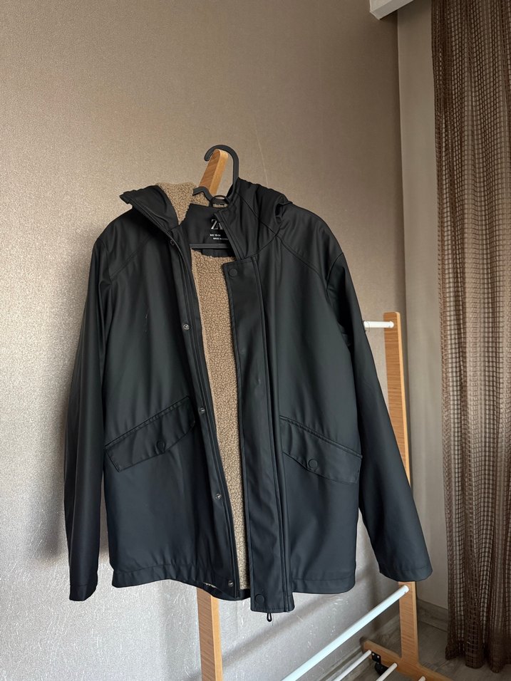 Erkekler için siyah, kapüşonlu, fermuarlı ceket. Notlu yaka, uzun kollu ve rahat kesim. İç kısmı yumuşak tüylü kumaşla kaplıdır.