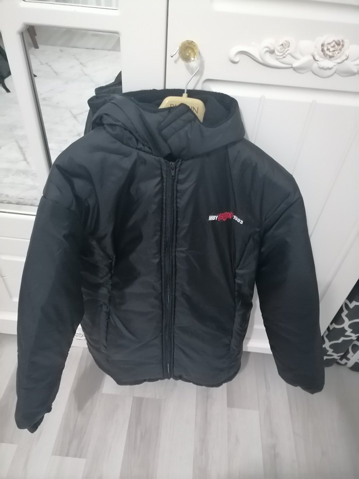 Siyah renkli, kapüşonlu ve fermuarlı, erkek montu 16 yaş yazıyor etiketi 17 yaş ve s beden uyumlu 2 kez giyildi