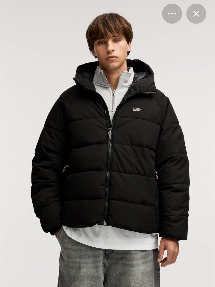Erkek siyah mont, yüksek yakalı ve fermuarlı, bol kesim ve normal boyda. Yumuşak ve sıcak kumaştan, kapüşonlu ve uzun kollu, günlük kullanım için uygun. Sadece büyük geldiği için satıyorum bir küçük bedeni L beden ile takasta yapabilirim