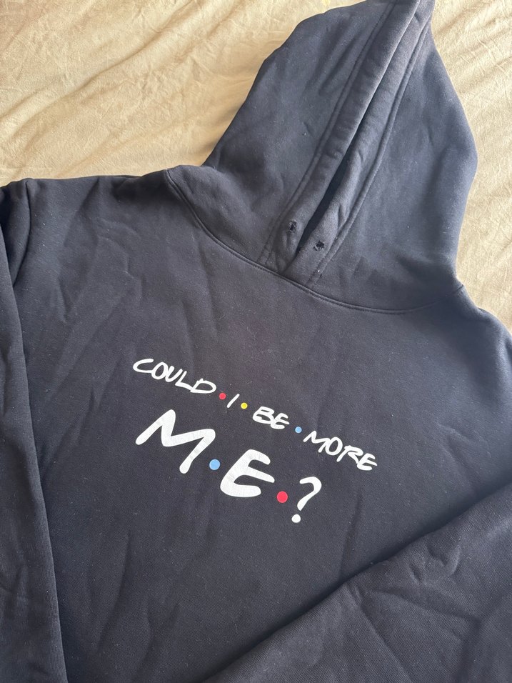 Uzun kollu, kapüşonlu rahat kesim siyah erkek sweatshirt. Önünde Friends dizisinin ünlü repliği "COULD I BE MORE ME" baskısı bulunur. Rahat kesimli ve yumuşak kumaştan, günlük sokak stiline uygundur. Kapüşonunun ipi kayıptır ancak başka bir siyah ip takılmasına engel olacak bir hasarı yoktur, yenisi takılabilir. Ürün %70 pamuk, %30 polyesterdir.