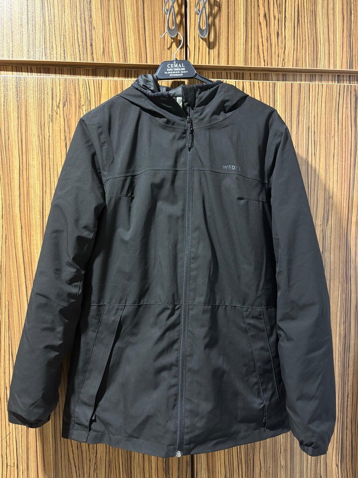 Erkek siyah kayak montu, sentetik kumaştan üretilmiş, kapüşonlu ve fermuarlı. Normal boy ve rahat kesimlidir, minimalist tarzda günlük kullanıma uygundur. ⛷️ arka kısmında ufak bir defosu vardır.